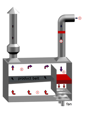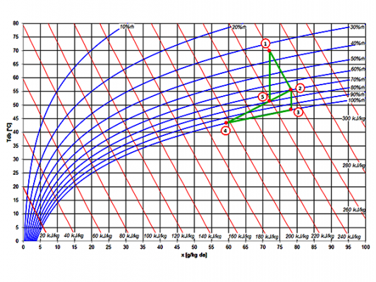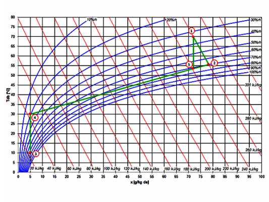 Hình bên trái cho thấy một nguyên tắc sấy thường được sử dụng. Quá trình cũng được vẽ trong sơ đồ Mollier dưới đây. Không khí nóng (1), trong trường hợp này là 70 ° C, được lưu thông qua một vành đai sản phẩm bên trong máy sấy. Không khí nóng được sử dụng để làm bay hơi nước ra khỏi sản phẩm cần sấy khô. Do đó, nhiệt độ của không khí giảm và độ ẩm của nó tăng lên. Không khí mát mẻ, ẩm ướt (2) đã cạn kiệt một phần, tuy nhiên, phần chính của không khí được tuần hoàn trong máy sấy. Để bù đắp cho không khí ẩm đã cạn kiệt, không khí khô bên ngoài được đưa vào chu trình (3) và được làm nóng trước (4). Sau khi làm nóng sơ bộ, không khí này được trộn với không khí ẩm tuần hoàn và hỗn hợp (5) được làm nóng hơn theo nhiệt độ quy trình cần thiết (1).