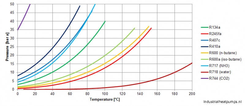Áp suất: Ở một nhiệt độ nhất định, áp suất ngưng tụ là khác nhau đối với các chất làm lạnh khác nhau. Đối với một số chất làm lạnh ở nhiệt độ cao, áp suất sẽ trở nên quá cao và các thành phần bơm nhiệt thông thường không còn có thể được áp dụng. Áp suất thấp là một rủi ro khác: đối với áp suất thấp, khối lượng cần quét sẽ tăng lên. Điều này đòi hỏi các thành phần lớn hơn và do đó tăng đầu tư. Hình dưới đây cho thấy nhiệt độ bay hơi là một hàm của áp suất đối với một số chất làm lạnh thường được sử dụng.