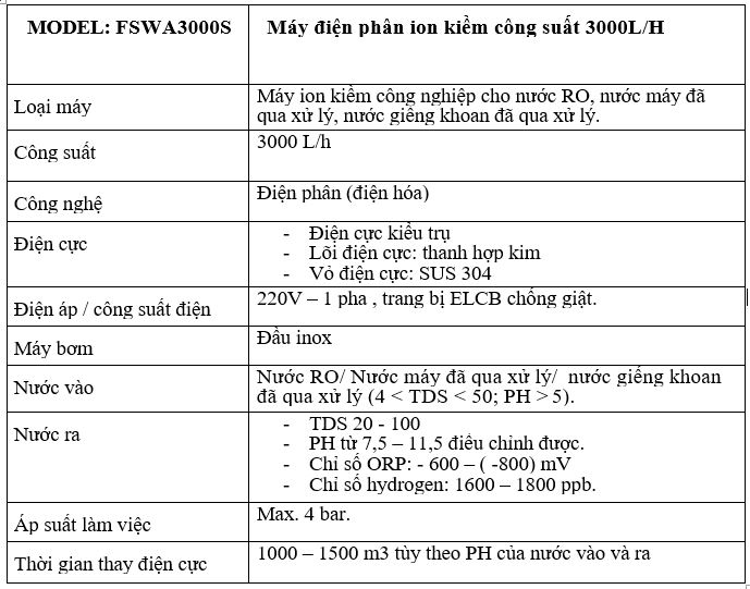 Thông số kỹ thuật Máy điện phân ION kiềm công suất 3000L/h.